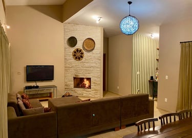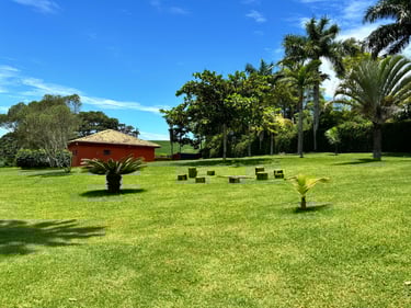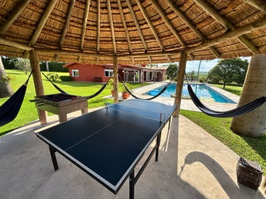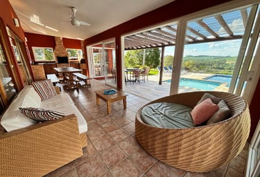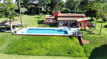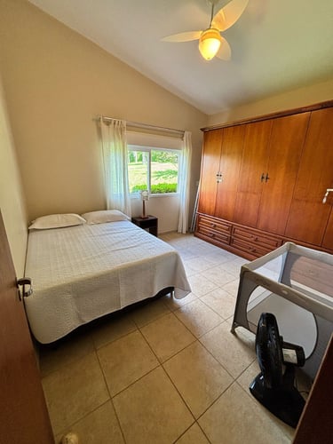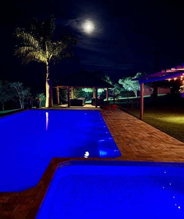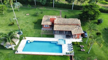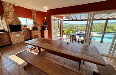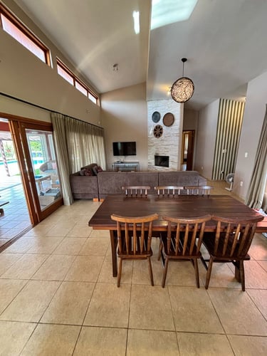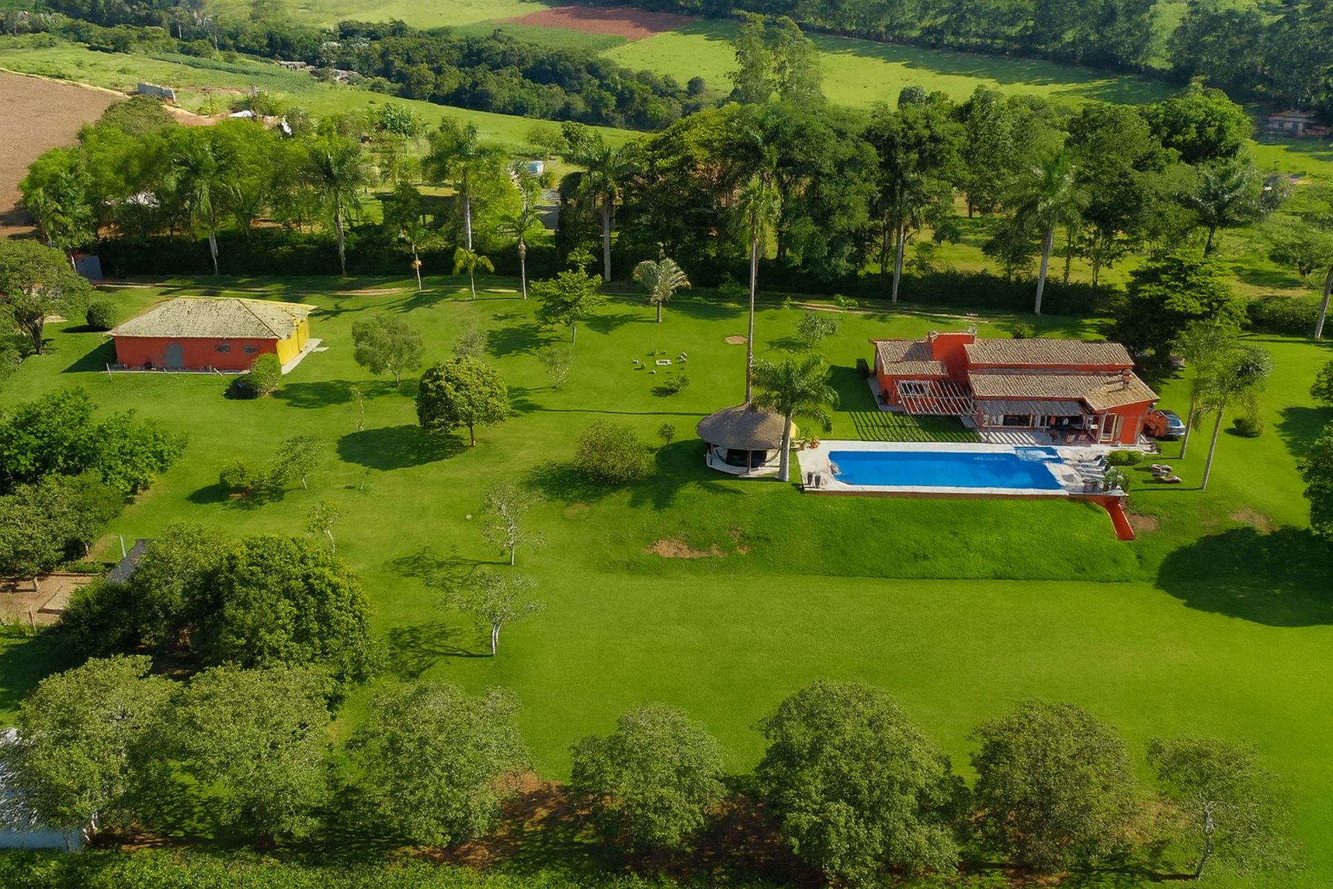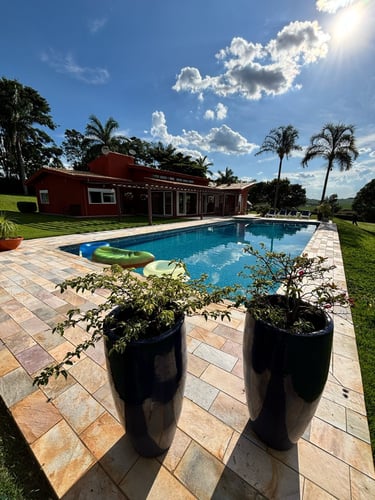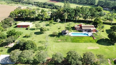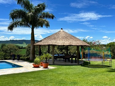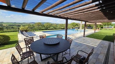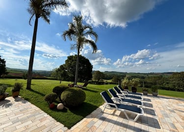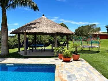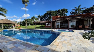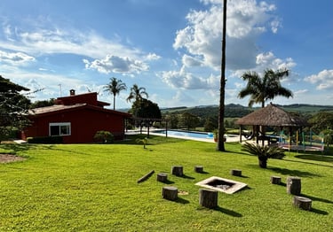 Com vista panorâmica e um pôr do sol de tirar o fôlego, o espaço oferece casa completa, duas suítes externas, varanda gourmet com churrasqueira e forno de pizza, piscina de 15m, quiosque com redes, espaço kids, pomar, horta e campo de futebol.